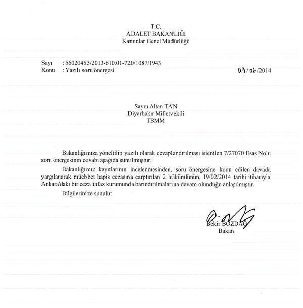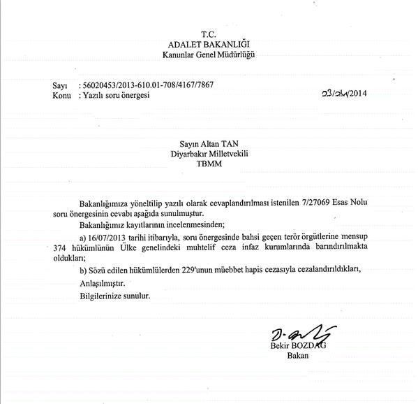 BDP Diyarbakır Milletvekili Altan Tan’ın “Hizbullah, İBDA-C, El-Kaide, Umut Davası davalarından toplam kaç mahpusun bulunduğu yönündeki soru önergesine Adalet Bakanı Bekir Bozdağ imzasıyla cevap verilmiştir.
