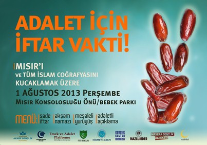 1 Ağustos Perşembe günü Mısır Konsolosluğu'nun önünde, Bebek Parkı’nda iftar için buluşuyoruz. İkramımız olan iftarın ardından Mısır'da askeri darbe ile görevine son verilip esir edilen Muhammed Mursi'ye, Adeviye Meydanı’nda günlerdir katledilenlere ve tutuklama furyasına kurban giden tüm kardeşlerimize destek olmak üzere konsolosluğa kadar meşaleli bir yürüyüş gerçekleştiriyoruz.