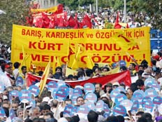 Mitinge Barış Anneleri, TMMOB, KESK, Eğitim Sen, Emekli Sen, Limter-İş, DTP, EMEP, SDP, ÖDP, Pir Sultan Abdal Kültür Derneği katıldı. KESK Genel Başkanı Sami Evren, Türkiye Yazarlar Sendikası Genel Sekreteri Tevfik Taş, DTP Eş Başkanı Emine Ayna, DTP milletvekilleri Pervin Buldan, Sırrı Sakık, Sebahat Tuncel, Osman Özçelik, ÖDP Genel Başkanı ve İstanbul Milletvekili Ufuk Uras, EMEP Genel Başkanı Levent Tüzel, SDP Genel Başkanı Filiz Koçali, Üniversite Öğretim Üyeleri Derneği Başkanı Prof. Dr. Tahsin Yeşildere de katıldı. Saat 14.00'te başlayan yürüyüşte önde "Tirkiye ji bo aştiya xwe dicive, ji bo pirsgirêka Kurd-Türkiye barışı için buluşuyor, Kürt sorununa demokratik çözüm" yazılı TBM pankartı açıldı. "Biji aşiti, bji brati", "Savaşa hayır barış hemen şimdi", "İnsanca yaşamak istiyoruz" sloganlarıyla kitle alana yürüdü. Güvenlik noktalarında yapılan detaylı aramalarda kadınlar eşarplarına kadar arandı, üzerinde bıçak bulunduğu iddia edilen bir kişi gözaltına alındı. Polis helikopteri sürekli kitleyi takip etti.
