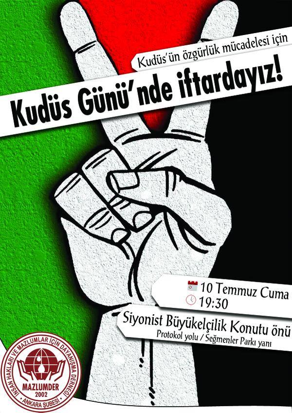 MAZLUMDER olarak, her sene olduğu gibi bu yıl da Dünya Kudüs Günü’nün 35. yılında Özgür Kudüs için Siyonist Elçilik Konutu önünde bir araya gelerek hep beraber iftarımızı açıyoruz.