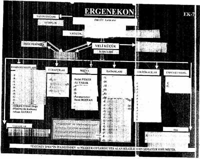 ERGENEKON Terör Örgütü iddianamesinin avukatlara teslim edilmeyen 157 sayfalık bölümü de tamamlandı. Bu bölümde Emniyet tarafından oluşturulan, terör örgütünün oluşumunu içeren bilgiler ile isimlerin bulunduğu Ergenekon şeması yer aldı. Şemada, dava kapsamında tutuklu bulunan isimler açık olarak yer alırken, soruşturmanın devam eden bölümlerinde adı geçenlerin isimleri ile Ergenekon Terör Örgütü Başkanı'nın adının savcılık tarafından üzerine kağıt konularak kapatıldığı görüldü.