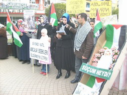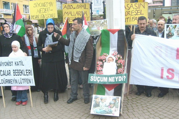 Basın açıklamasında küçük bir çocuğun "SİYONİST KATİL AMCALAR BEBEKLERİ ÖLDÜRMEYİN LÜTFEN" yazısı dikkati çekti.Gazze'de ölündürülen bebeklere çok üzüldüğü için bu gösteriye katılan 8 yaşındaki çocuğun aynı zamanda, sınıf arkadaşlarından Gazze'deki mazlum insanlar için 18 TL para toplayıp, Albaraka Türk bankasından İ.H.H'nın hesabına yatırdığı öğrenildi.Katliama çok üzüntülü olduğunu söyleyen küçük çocuk, İ.H.H ya gönderdiği paranın makbuzunu basına gösterdi.Mizansen olarak tabut içinde bir bebek, Filistin bayrakları ve üzerinde" SUÇUM NEYDİ" yazısı dikkati çekti.