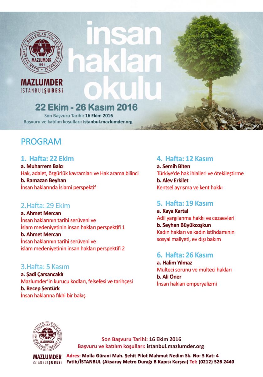 MAZLUMDER İstanbul Şubesi, 2002 yılından bu yana sürdürdüğü “İnsan Hakları Okulu”nun 12.’sini 22 Ekim / 26 Kasım 2016 tarihleri arasında gerçekleştirecektir.