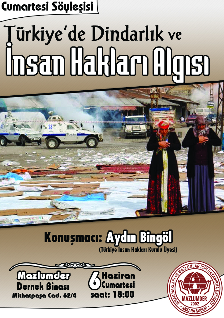 İnsan hakları bağlamında güncel meselelerin ele alındığı Cumartesi Söyleşileri'nde bu ay, Türkiye İnsan Hakları Kurulu Üyesi Aydın BİNGÖL'ün katılımıyla 'Türkiye'de Dindarlık ve İnsan Hakları Algısı' başlığı konuşulacak.