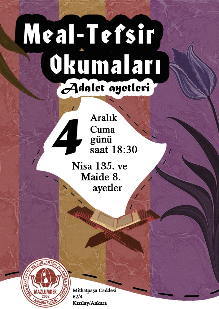 MAZLUMDER Ankara Şubesi olarak düzenlediğimiz Meal-Tefsir Okumaları 5 Aralık Cuma günü saat 18:30'da beşinci dersi ile devam ediyor. Bu hafta Nisa Sûresi 135 ve Maide Sûresi 8. ayetleri üzerinde durulacaktır.