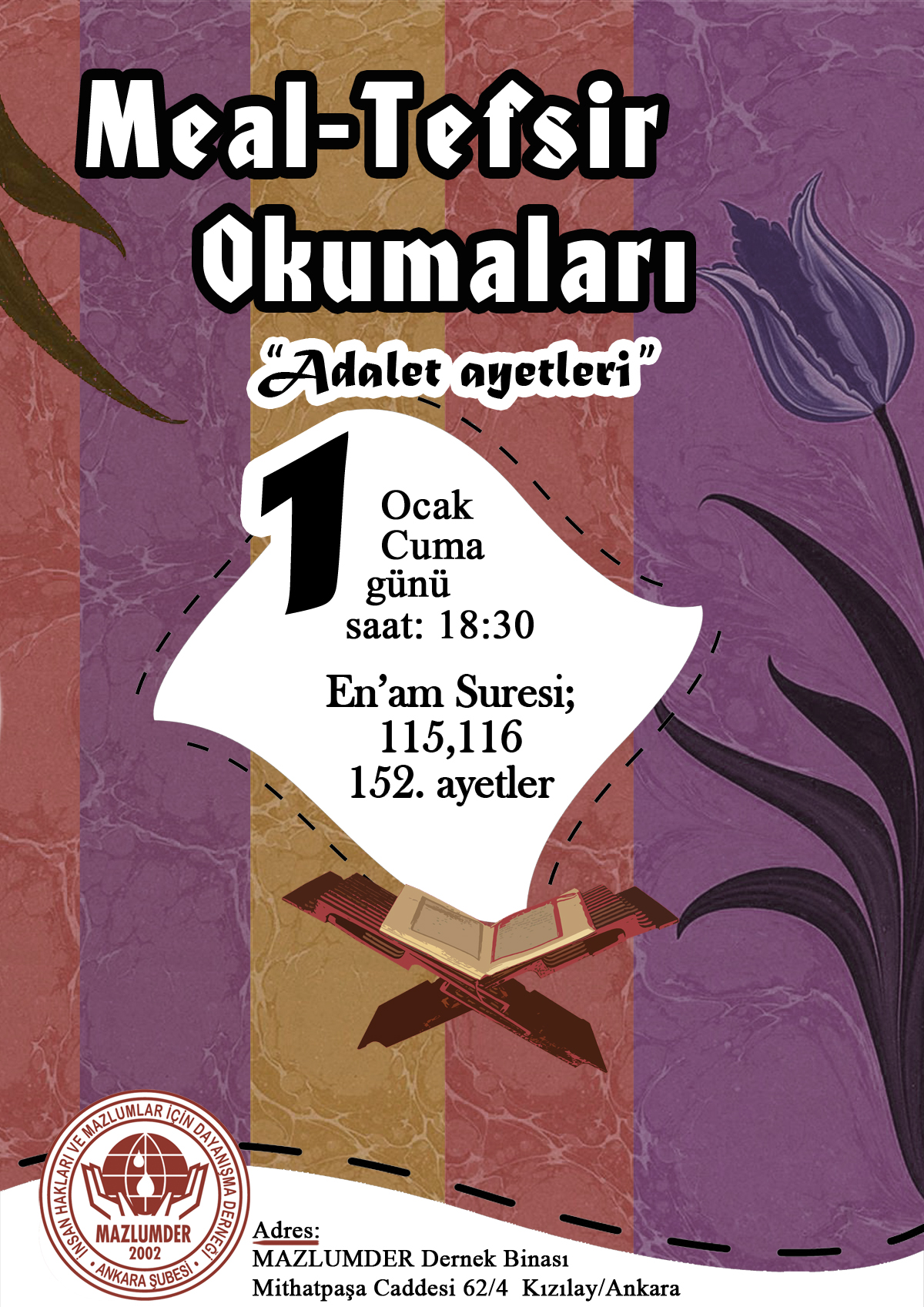 MAZLUMDER Ankara Şubesi olarak düzenlediğimiz Meal-Tefsir Okumaları 1 Ocak Cuma günü 18:30'da yapılacak ders ile devam ediyor. Bu hafta Enam Suresi 115,116, 152.. ayetler üzerinde durulacaktır.