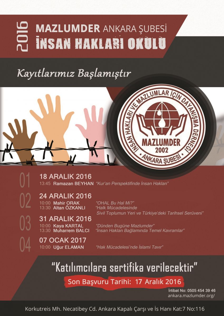 MAZLUMDER Ankara Şubesi tarafından düzenlenen İnsan Hakları Okulu, bu yıl da alanında uzmanlaşmış kişilerin sunumlarıyla 18 Aralık 2016 Pazar günü başlıyor. Okulumuza katılım kontenjanımız 25 kişi ile sınırlı olup, en geç 17 Aralık Perşembe gününe kadar başvuru formunun doldurularak teslim edilmesi gerekmektedir. Katılım ücretsiz olup devamlılık durumuna göre sertifika verilecektir.