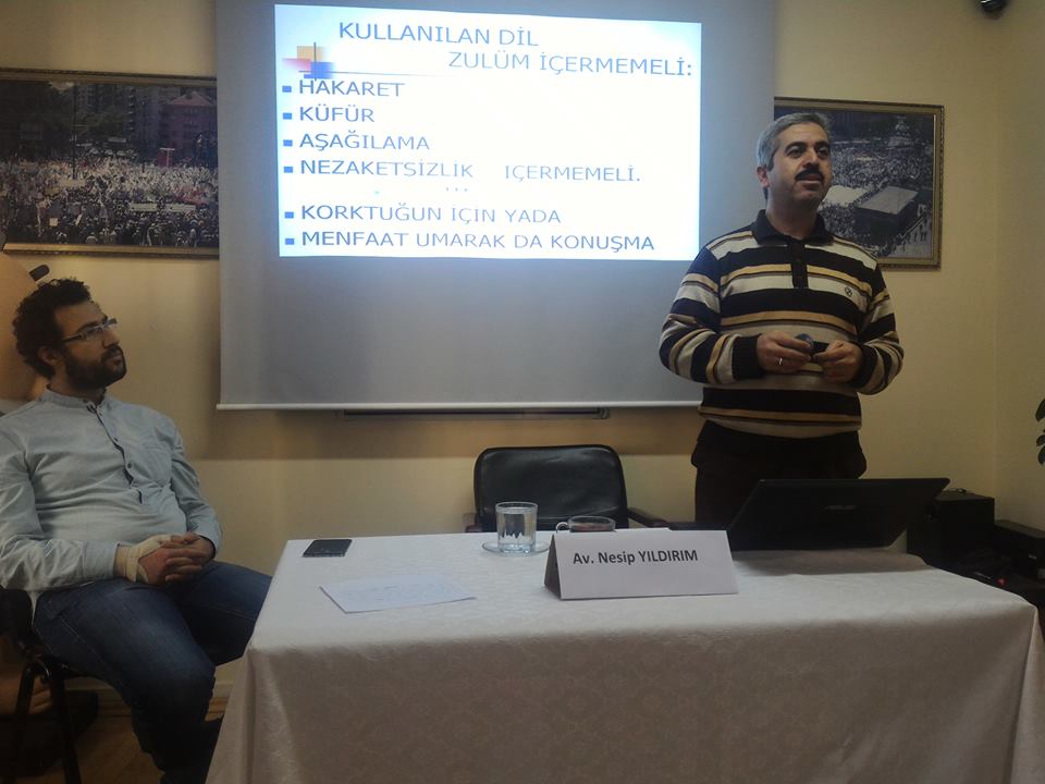 Av. Nesip Yıldırım sunumunda, dilin insanın düşünce dünyasının bir aynası olarak değerlendirilebileceğini söylerken, ‘Yürütülen insan hakları mücadelesinin; tutarlı, ikna edici ve başarılı olması kullanılan dile bağlıdır.’ dedi.