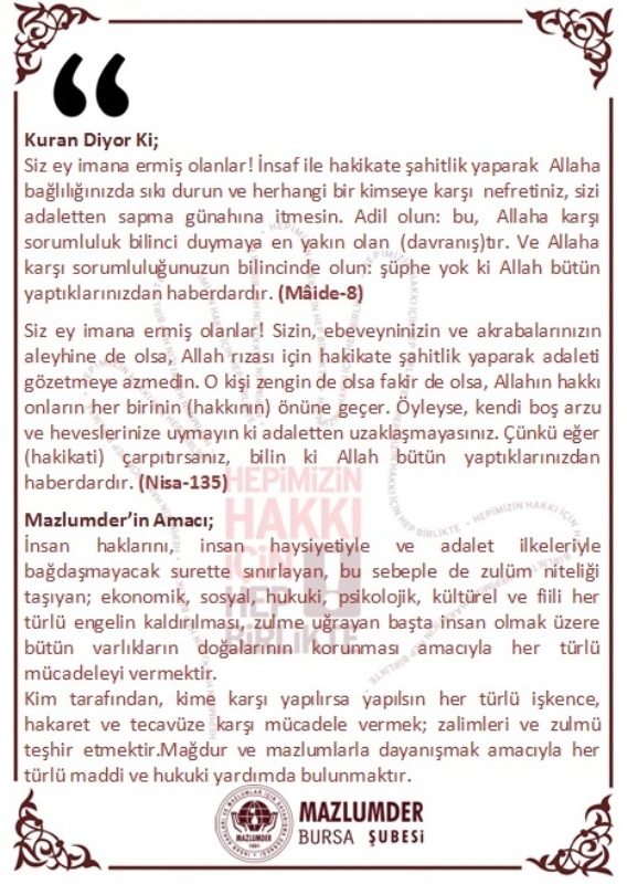 Şakir Çalışkan, Mazlumder olarak, 28 Şubat kararları, andımız, başörtüsü vb. yürütülmüş olan mücadelelerden örnekler vererek, Mazlumder ve Bursa Şube olarakta ibadet hakkı ihlalleri ile ilgili yürütülen çalışmalardan örnekler sundu. Özel sözleşmelerde çalışanların ibadet hakkından mahrum bırakıldığını ve kamu/özel hukuk ayrımı yapılmaksızın ibadet hakkı ile ilgili yasal düzenlemeye ihtiyaç duyulduğunu söyledi. T.C Anayasasının 90. Maddesi gereği üst norm olarak kabul edilen uluslararası hukuka göre de ibadet hakkının bir lütuf değil hak olduğuna değindi.