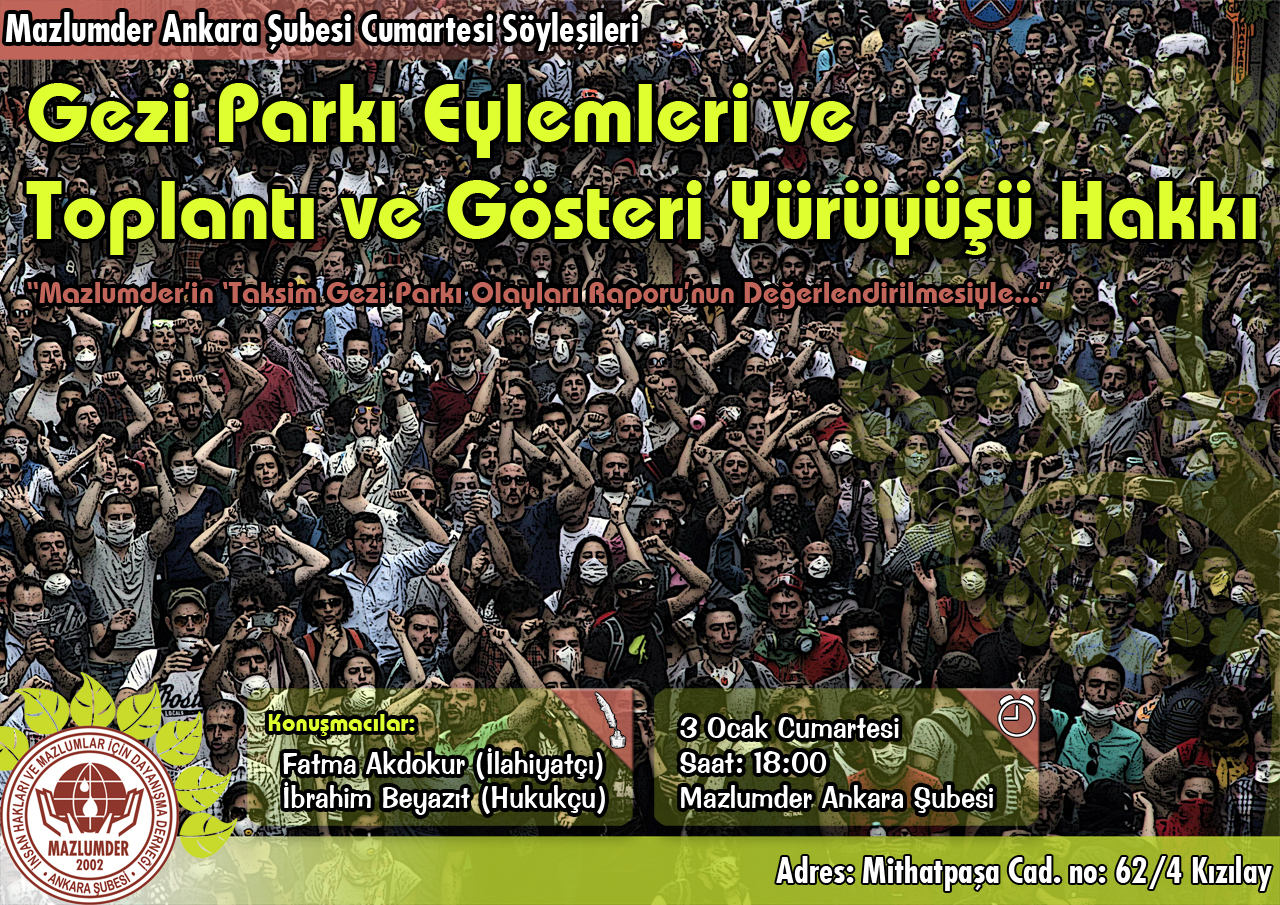 MAZLUMDER Ankara Şubesi tarafından her ay İnsan Hakları bağlamında farklı bir konunun ele alındığı ’Cumartesi Söyleşileri’nin ikincisi '' Gezi Parkı Eylemleri ile Toplantı Gösteri ve Yürüyüş Hakkı'' konusuyla 03 Ocak Cumartesi günü 18.00'de MAZLUMDER dernek binasında başlayacaktır.