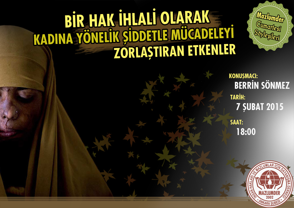 MAZLUMDER Ankara Şubesi tarafından her ay İnsan Hakları bağlamında farklı bir konunun ele alındığı ’Cumartesi Söyleşileri’nin üçüncüsü ''Bir Hak İhlali Olarak Kadına Yönelik Şiddetle -Mücadeleyi Zorlaştıran Etkenler'' konusuyla 07 Şubat Cumartesi günü 18.00'de MAZLUMDER dernek binasında başlayacaktır.