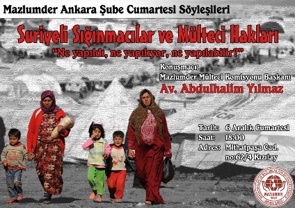 MAZLUMDER Ankara Şubesi tarafından her ay İnsan Hakları bağlamında farklı bir konunun ele alınarak organize edildiği Cumartesi Söyleyişilerinin ilki '' Suriyeli Mülteciler ve Mülteci Hakları '' ile 06 Aralık Cumartesi günü 18.00'de Mazlumder dernek binasında başlayacaktır.