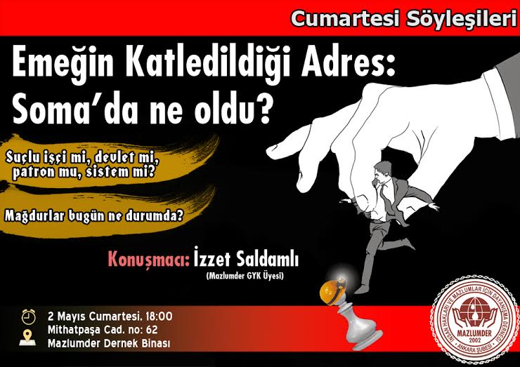 MAZLUMDER Ankara Şubesi tarafından her ay İnsan Hakları bağlamında farklı bir konunun ele alındığı ’Cumartesi Söyleşileri’nin beşincisi '' Emeğin Katledildiği Adres, Soma'da Ne Oldu'' konusuyla 02 Mayıs Cumartesi günü 18.00'de MAZLUMDER dernek binasında başlayacaktır.