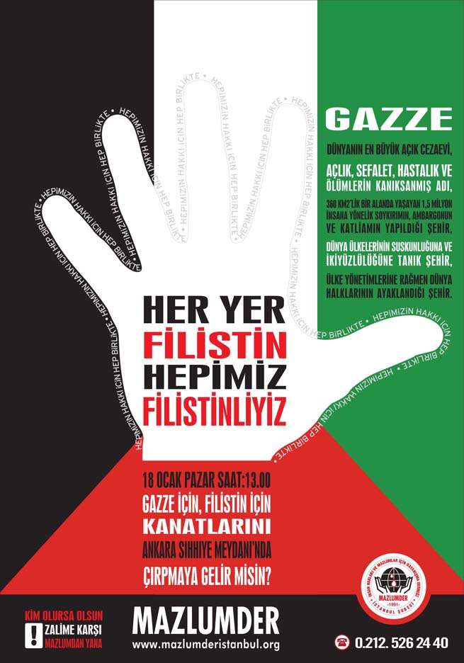 MAZLUMDER, HAK-İŞ, MEMUR-SEN, MÜSİAD ve AGD tarafından Gazze için ortak düzenlenen “Her Yer Filistin, Hepimiz Filistinliyiz” mitingi, 18 Ocak Pazar günü 13.00’te Ankara Sıhhiye Meydanı’nda gerçekleştirilecek.