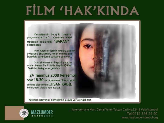 MAZLUMDER İstanbul Şubesi olarak, kültürel etkinlikler çerçevesinde düzenlediğimiz sinema günleri devam ediyor…Bu hafta, sinema eleştirmeni İhsan Kabil’in katılımıyla, İran Sineması’nın başarılı yapıtlarından biri olan, Majid Majidinin yönettiği BARAN filmi gösterilecek.