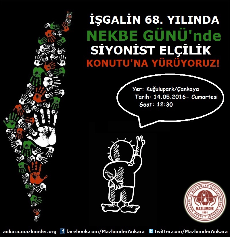 MAZLUMDER Ankara Şubesi olarak her sene olduğu gibi bu yıl da Kuğulu Park'ta buluşarak Siyonist Elçilik Konutu'na yürüyeceğiz ve orada basın açıklaması okuyacağız.