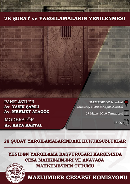 MAZLUMDER Cezaevi Komisyonu tarafından, “28 Şubat Yargılamalarında Yaşanan Hukuksuzluklar ile 28 Şubat Yargılamalarının Yenilenmesi Başvuruları Karşısında Ceza Mahkemeleri ve Anayasa Mahkemesinin Tutumu” başlıklarının değerlendirileceği bir panel düzenleniyor.