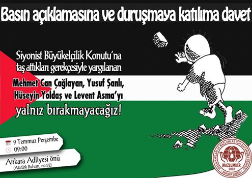 Bizler Mazlumder Ankara Şubesi üye ve gönüllüleri ve Filistin dostları olarak Siyonist Rejim'i protesto ettiklerinden dolayı 'kamu davası'ndan yargılanan Mehmet Can Çağlayan, Yusuf Şanlı, Levent Asma ve Hüseyin Yoldaş kardeşlerimizi yalnız bırakmamak için duruşma tarihleri olan 9 Temmuz'da Ankara Adliyesi ana giriş kapısı önünde 'Protesto Edenler Değil Katiller Yargılansın' demek üzere bir araya geleceğiz.