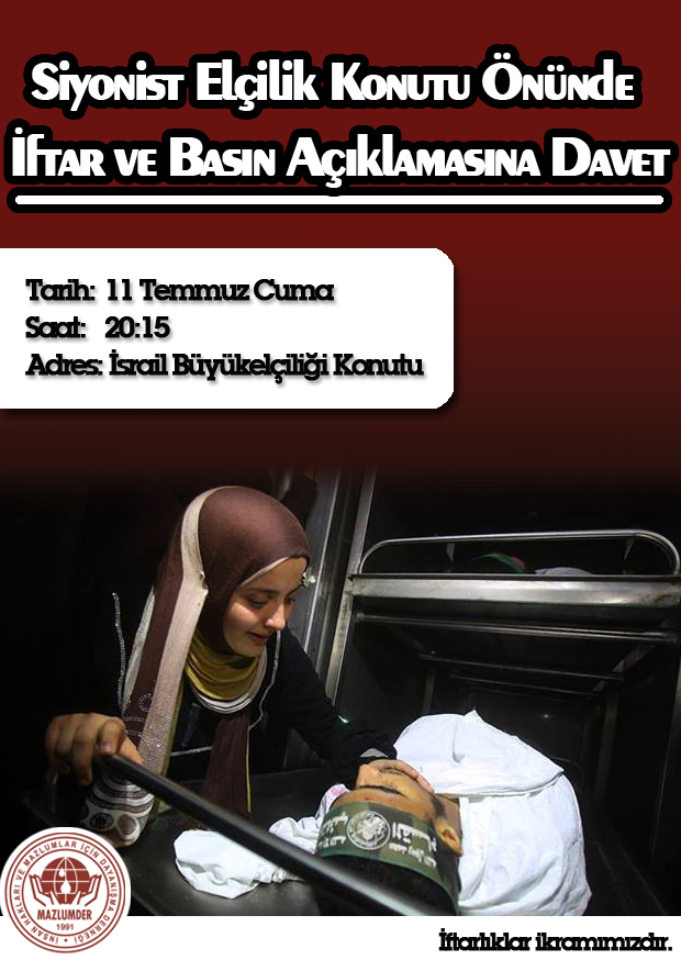 Bu insanlık dramına sessiz kalmamak için İsrail Büyükelçiliği önünde basın açıklaması ve iftar yapılacaktır. Basını ve duyarlı tüm halkımızı davet ediyoruz.
