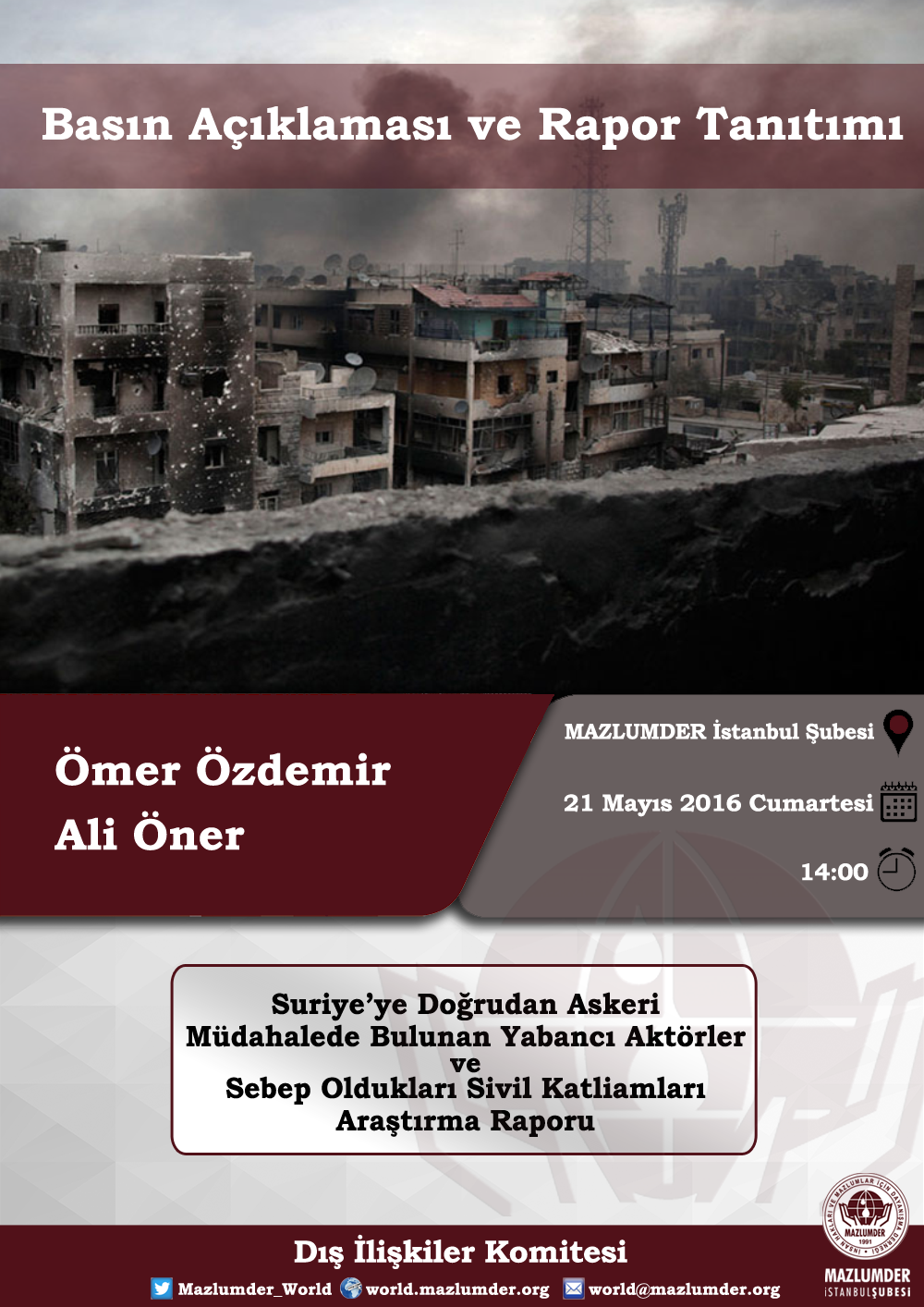 MAZLUMDER İstanbul Şubesi Dış İlişkiler Komitesi tarafından hazırlanan “Suriye’ye Doğrudan Askeri Müdahalede Bulunan Yabancı Aktörler ve Sebep Oldukları Sivil Katliamları” başlıklı rapor 21 Mayıs Cumartesi günü dernek merkezinde yapılacak bir basın açıklamasıyla yayınlanacak.