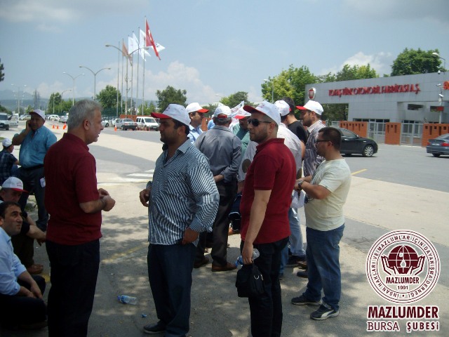 Mazlumder Gn. Bşk. Yrd. Ve Bursa Şube Yönetim Kurulu Üyesi İzzet Saldamlı ve Bursa Şube Yönetim Kurulu Üyesi Samet Solakoğlu 9 Haziran’da TOFAŞ Otomobil Fabrikası’nda tekrar alevlenen emekçi eylemleri ile ilgili, Hak-İş’e bağlı Çelik-İş Teşkilatlanma Genel Sekreteri Recep Akyel, İşçi Temsilcisi Soner Şahin ve fabrika bahçesinde bekleyen diğer işçilerle son durum ile ilgili görüşmelerde bulundu.