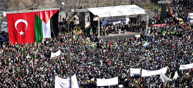MAZLUMDER, HAK-İŞ, MEMUR-SEN, MÜSİAD ve Anadolu Gençlik Derneği tarafından düzenlenen ve birçok sivil toplum kuruluşunun da destek verdiği ''Her Yer Filistin, Hepimiz Filistinliyiz'' mitingi 18 Ocak Pazar günü Ankara Sıhhiye Meydanı’nda yapıldı. Birçok ilden gelen katılımcılarla birlikte Sıhhiye Meydanı tarihi günlerinden birini yaşadı.